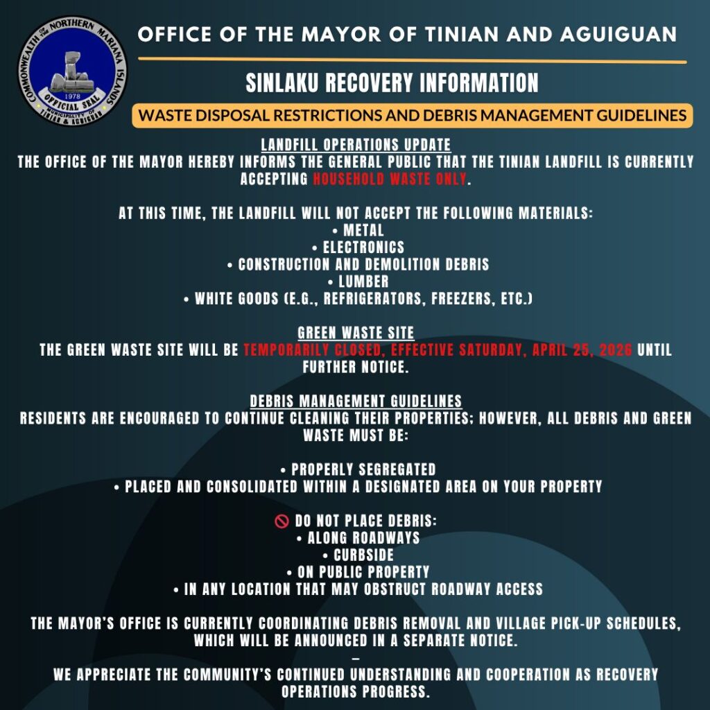 The Office of the Mayor hereby informs the general public that the Tinian Landfill is currently accepting household waste ONLY.