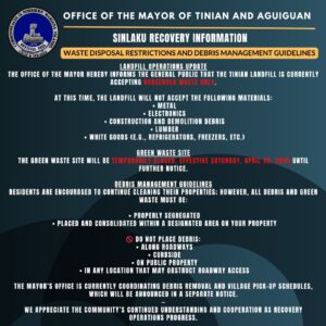 Tinian – Typhoon Sinlaku Recovery Efforts LANDFILL OPERATIONS UPDATEThe Office of the Mayor hereby informs the general public that the Tinian Landfill is currently accepting