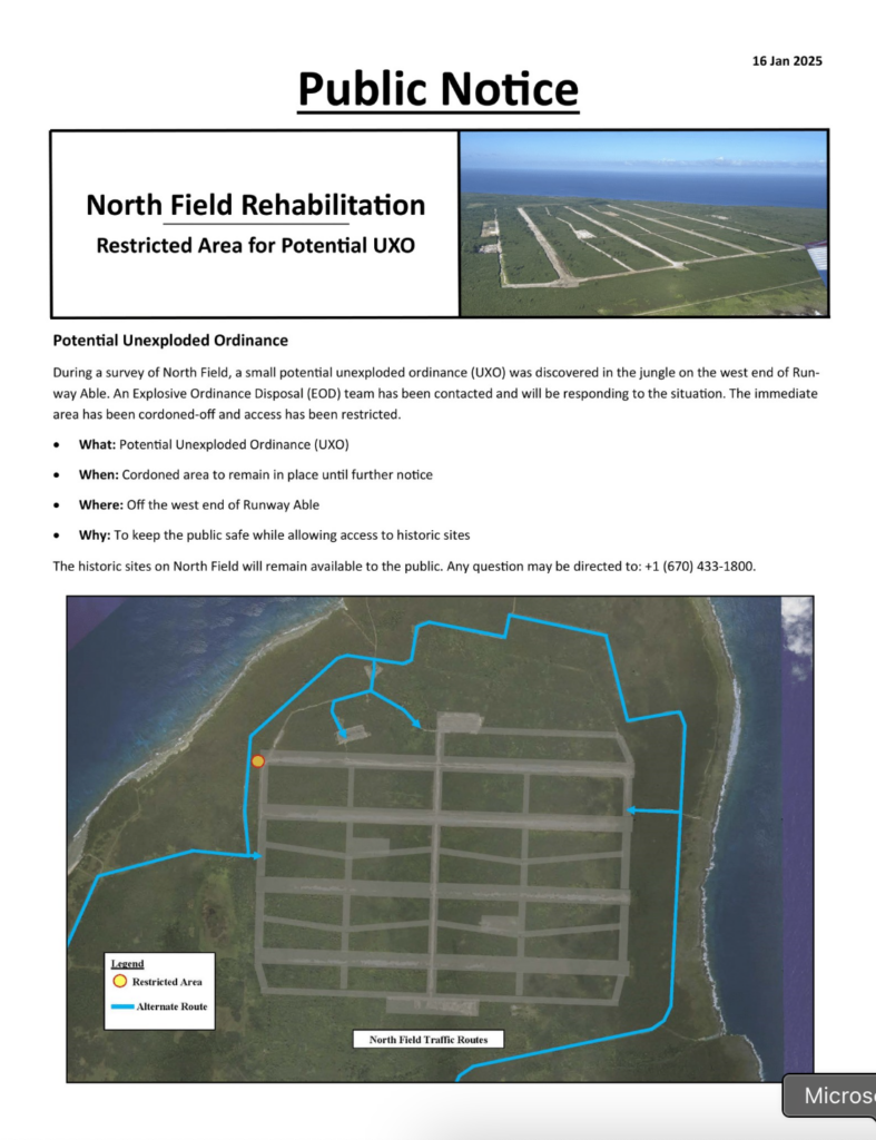 The historic sites on North Field will remain available to the public. Any question may be directed to: +1 (670) 433-1800.