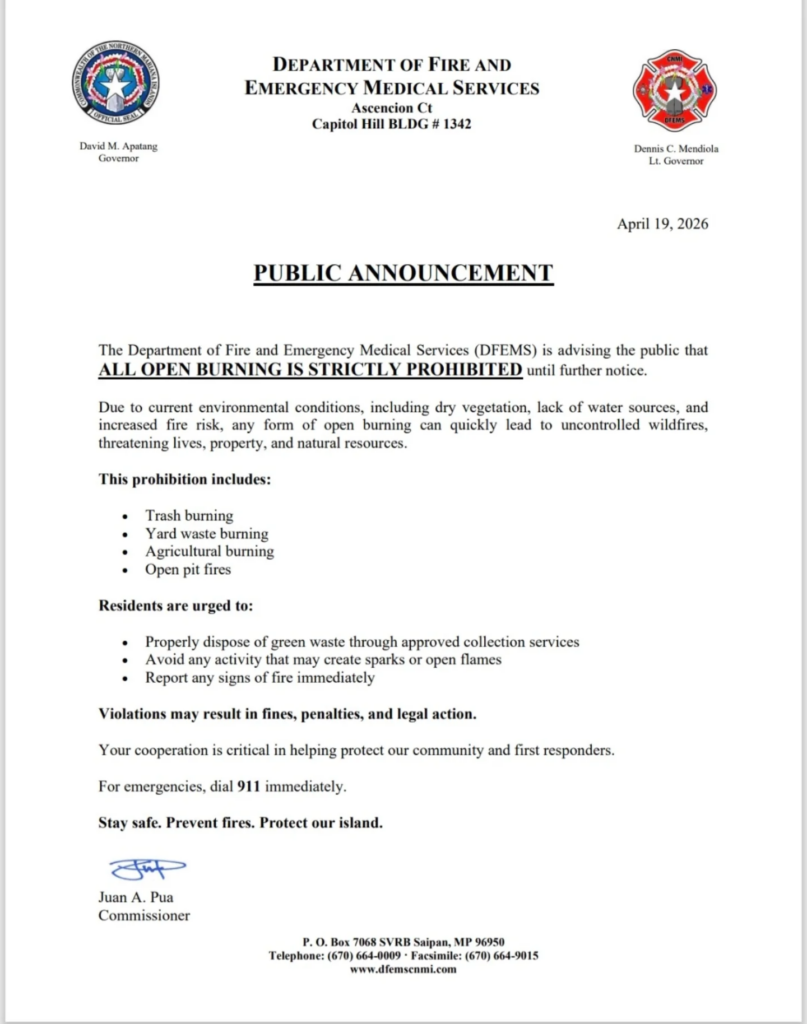 The Department of Fire and Emergency Medical Services (DFEMS) is advising that ALL OPEN BURNING IS STRICTLY PROHIBITED until further notice.