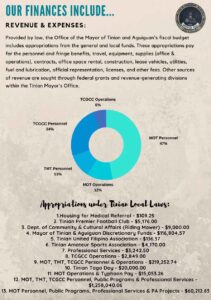 The Office of the Mayor of Tinian and Aguiguan works to foster and promote safety, cleanliness, and an equal opportunity for all of its residents to grow, develop, prosper, and live in harmony with respect to one another for the betterment of the community as an entirety.